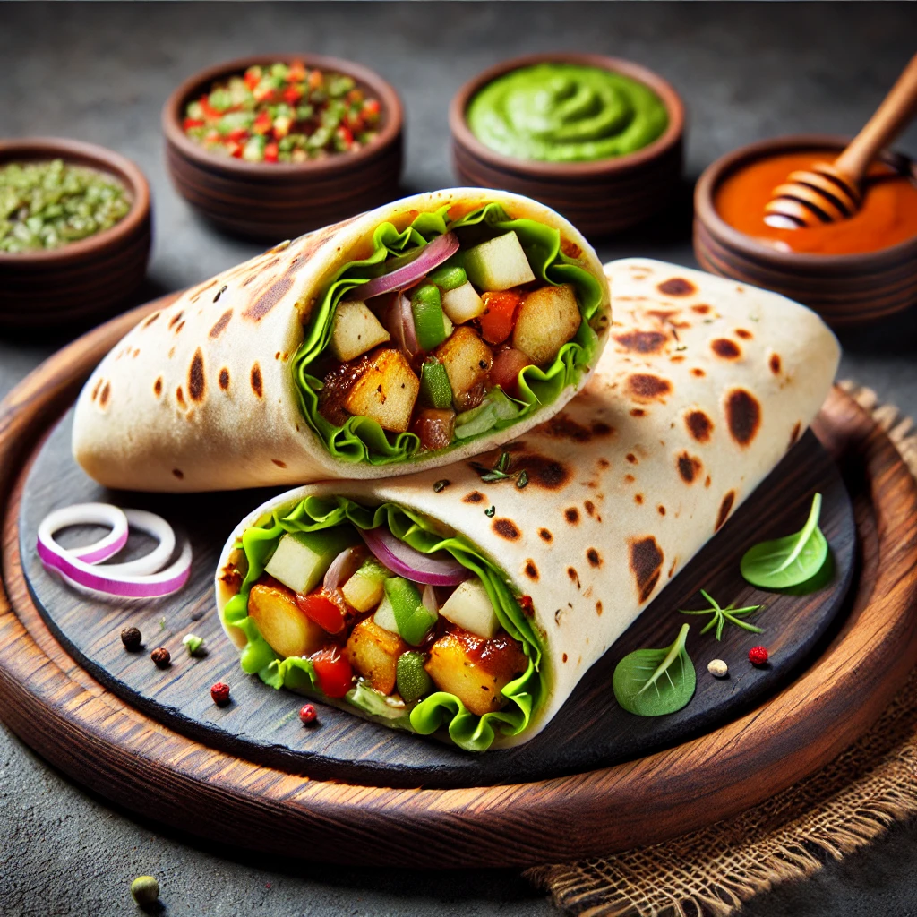Veggie Roll – A soft flatbread wrap filled with a delicious mix of fresh vegetables, spiced potatoes, and tangy sauces. Garnished with lettuce, sliced onions, and a drizzle of mint chutney, it’s a perfect grab-and-go snack bursting with flavor!